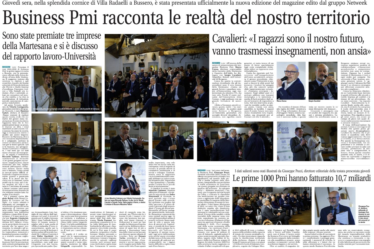 Donato Turba, presidente della Confcommercio territoriale di Melzo, ha preso parte alla quinta tappa (a Bussero) del tour 2025-2026 di Business Pmi con la presentazione della rivista dedicata all'area della Martesana. L'incontro, dal titolo "Pmi e università: alleati per competere nel mondo che cambia" si è svolto a Villa Redaelli. Premiati l'azienda Ronchi Mario di Gessate (miglior fatturato); Affidea Lombardia (miglior utile); Zucchetti Srl (migliore crescita del fatturato).
